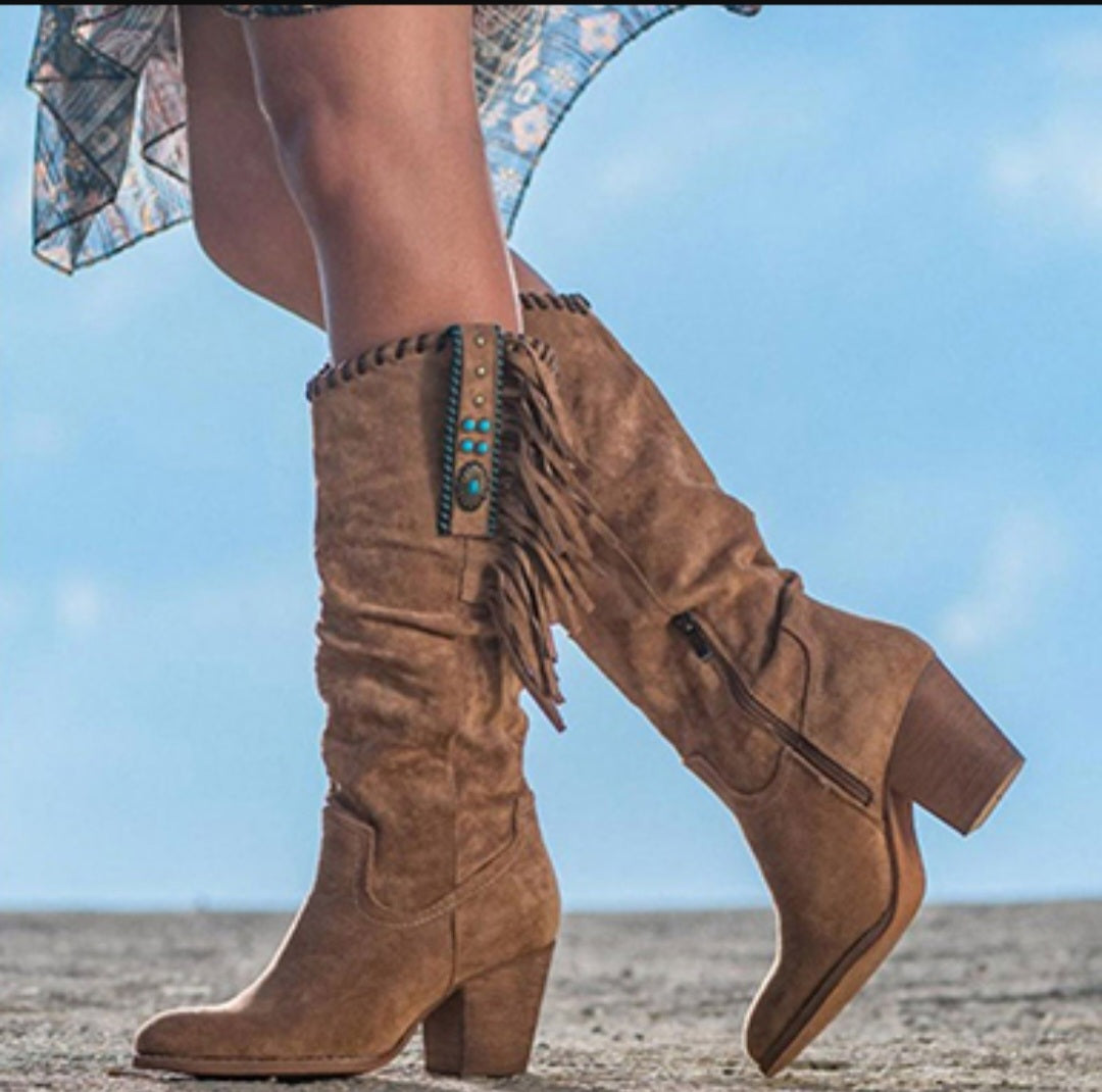 Women's Suede Cowboy Boots - Fringe Trim / Turquoise Stones